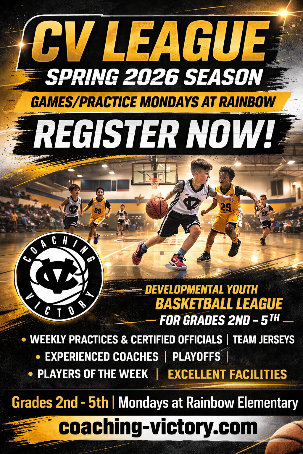 The CV League (Coaching Victory League) is our Spring developmental basketball program for boys and girls in grades 2nd through 5th. Held on Monday nights at Rainbow Elementary School beginning April 13th, the league focuses on skill development, fundamentals, and organized game play in a positive, structured environment. Players practice weekly, compete in games officiated by certified referees, and use a 28.5 basketball to support proper development. The season runs April through May and includes playoffs and championships.